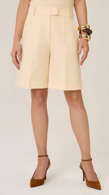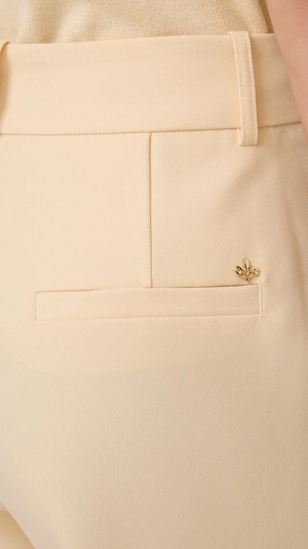 Modelagem reta com comprimento elegante e cintura média. Possui bolsos discretos, passantes para cinto e fechamento clássico.