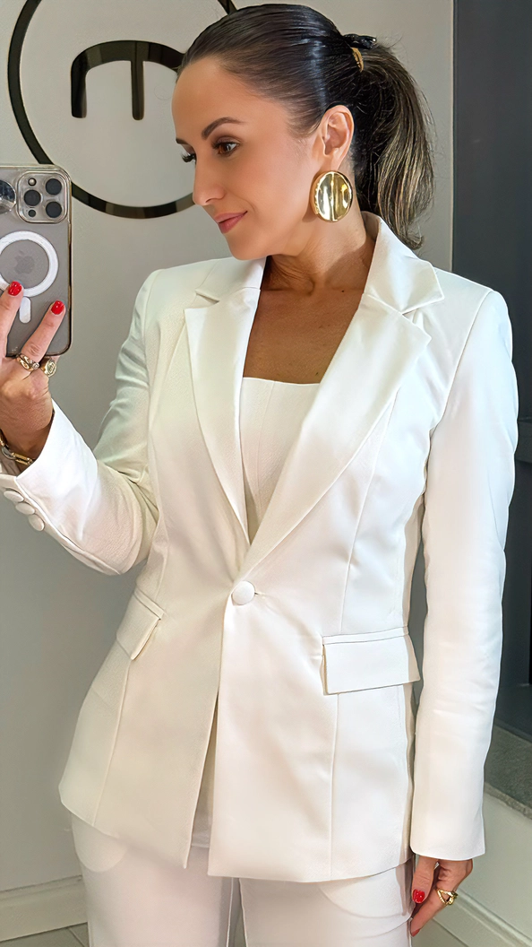 Modelagem alongada com alfaiataria estruturada valorizando o corpo. Tecido encorpado, toque macio,