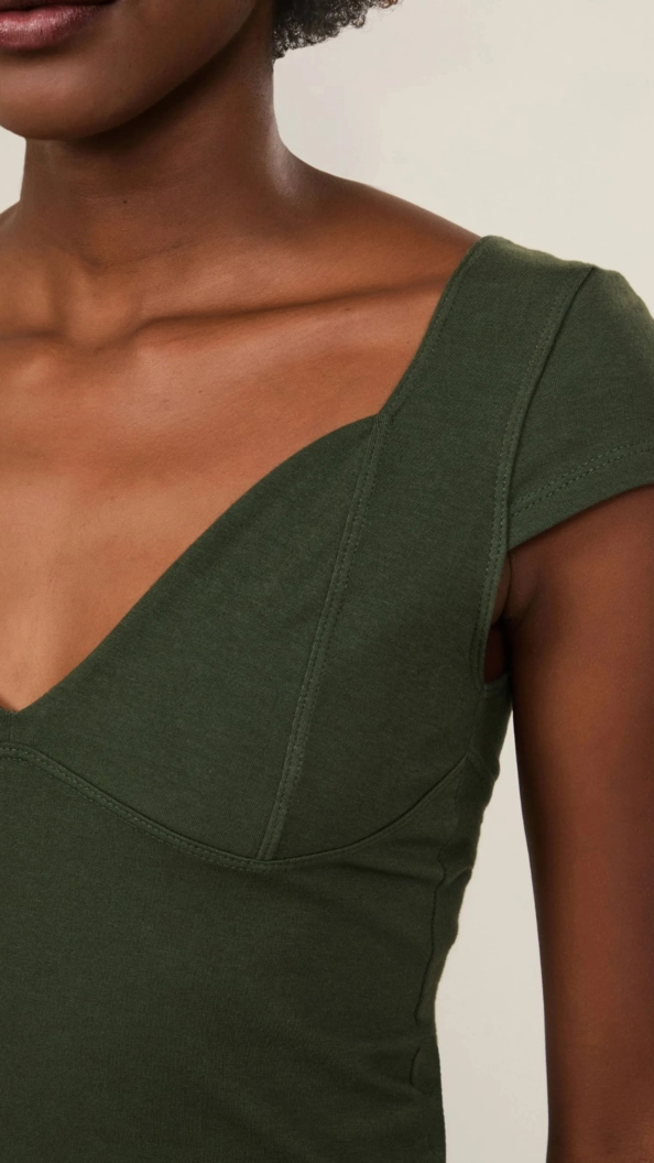 Modelagem justa ao corpo, decote V profundo e mangas curtas ajustadas. Recorte anatômico realça o busto e cria uma silhueta feminina e sofisticada.