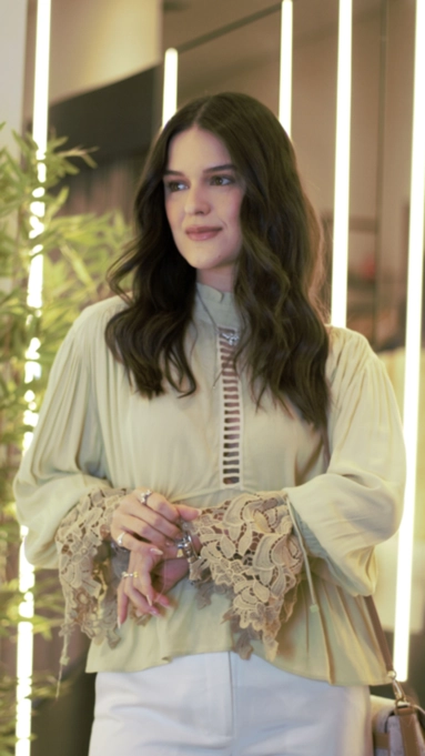Traz um charme inconfundível com modelagem fluida e punho em renda guipir, um toque artesanal que transforma o visual.