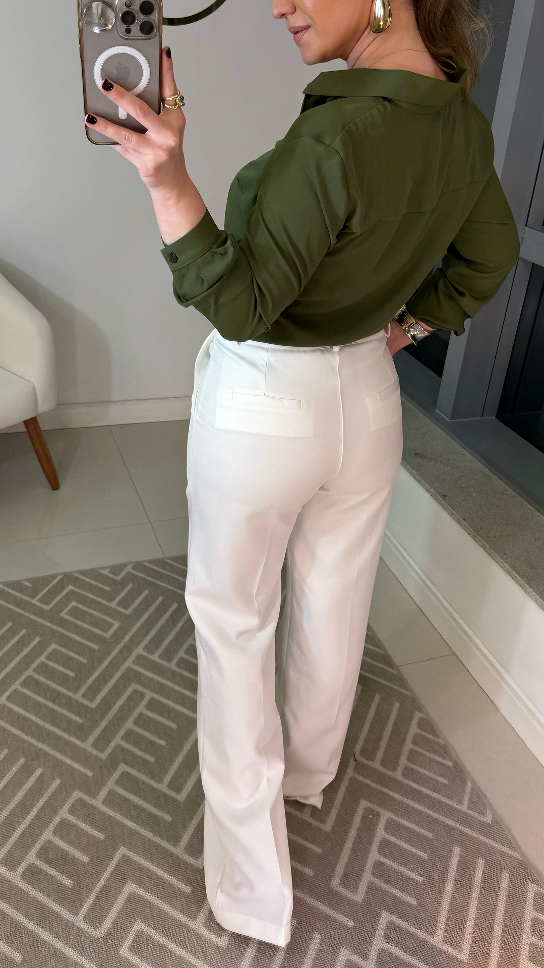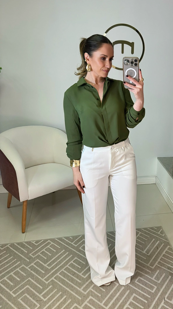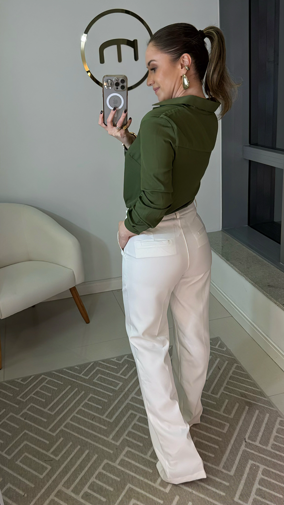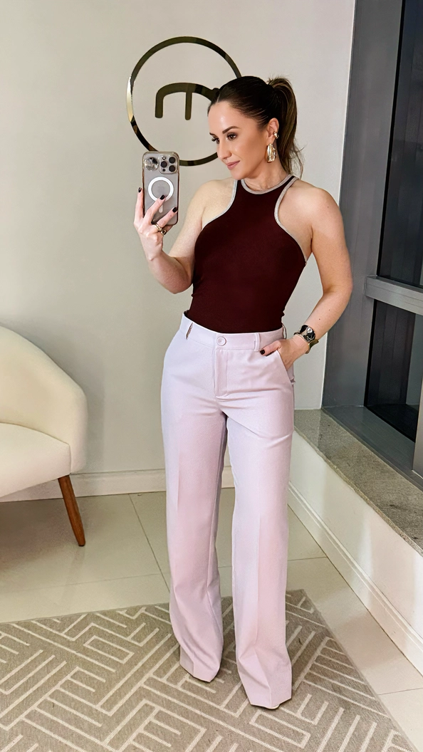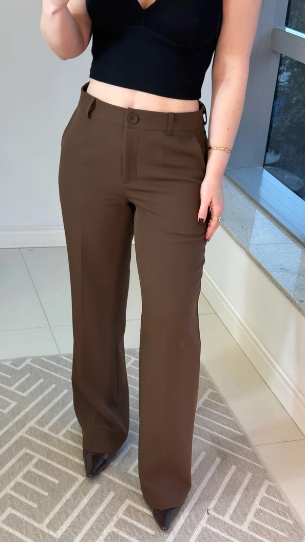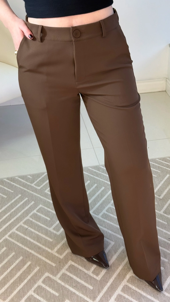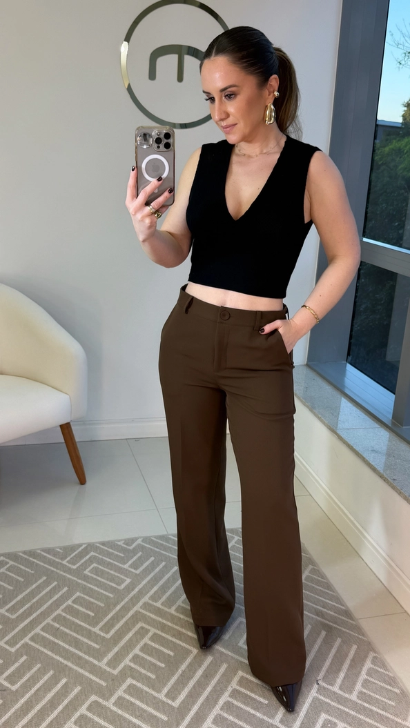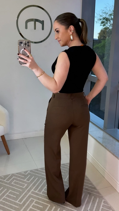 Modelagem reta com cintura média/alta, que valoriza a silhueta sem abrir mão do conforto. Possui bolso faca funcional, passantes para cinto e fechamento com botão forrado – detalhe discreto que transmite sofisticação. O tecido de alfaiataria tem caimento impecável e toque macio, garantindo estrutura e leveza na medida certa.