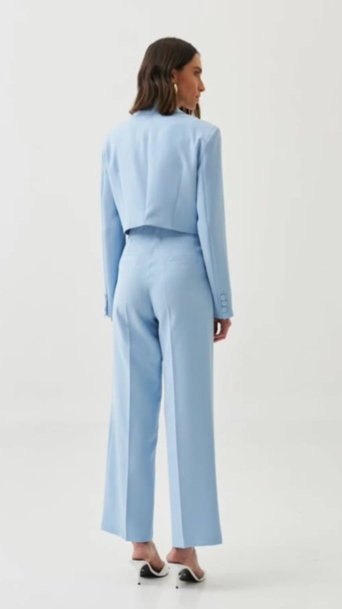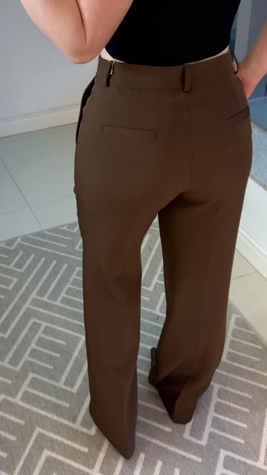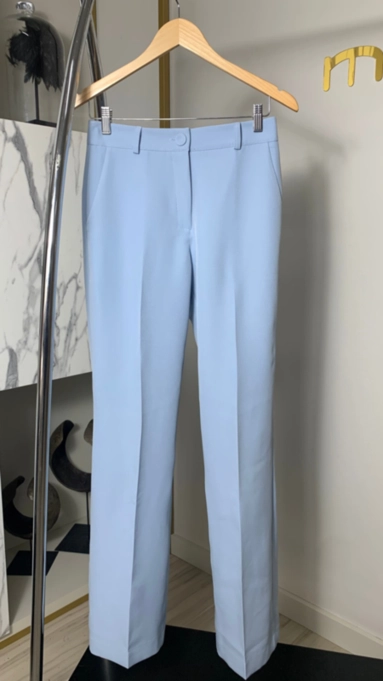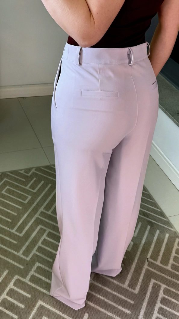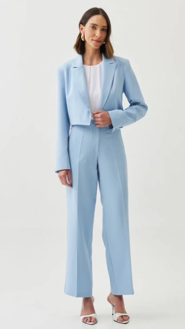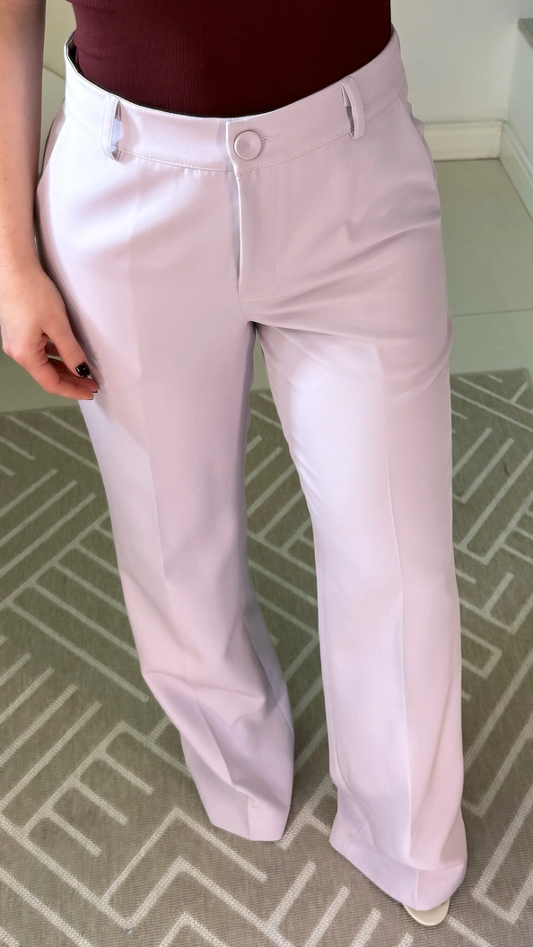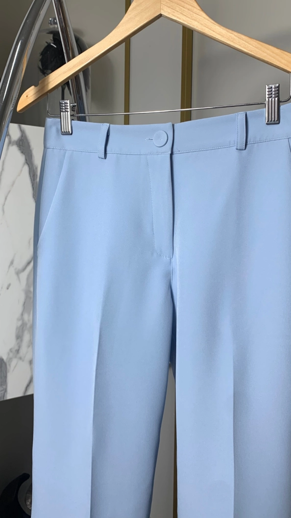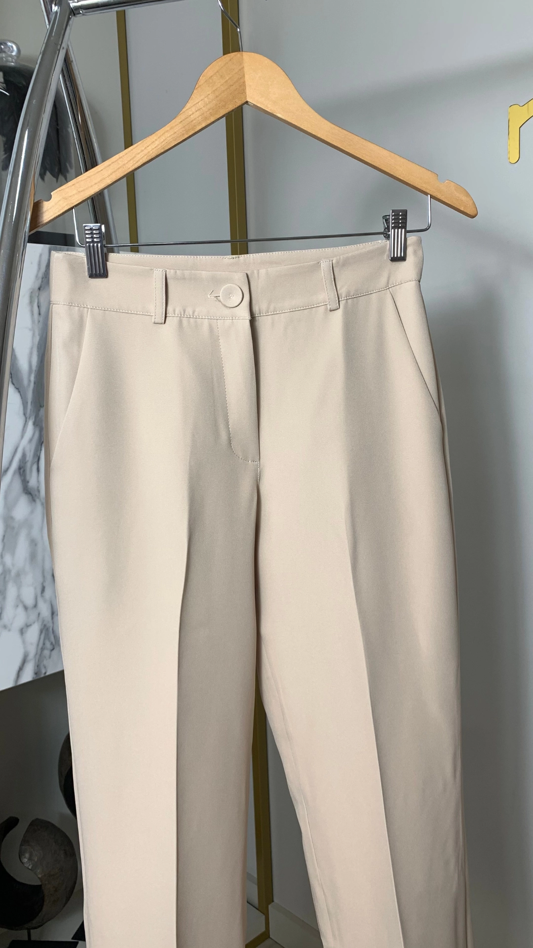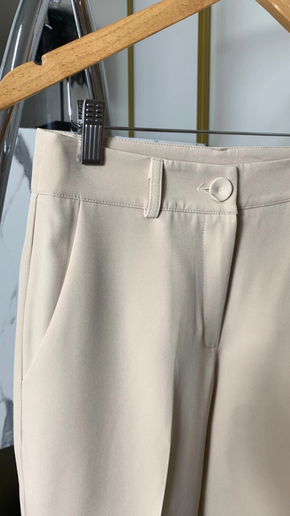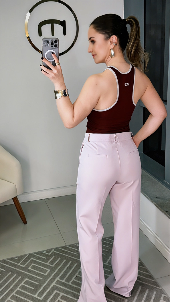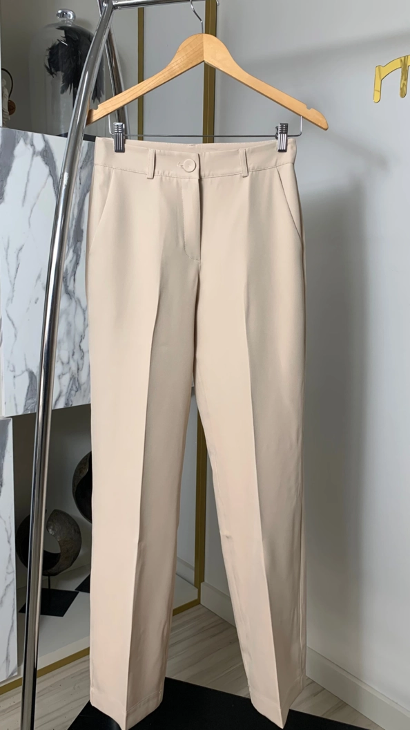 Modelagem reta com cintura média/alta, que valoriza a silhueta sem abrir mão do conforto. Possui bolso faca funcional, passantes para cinto e fechamento com botão forrado – detalhe discreto que transmite sofisticação. O tecido de alfaiataria tem caimento impecável e toque macio, garantindo estrutura e leveza na medida certa.