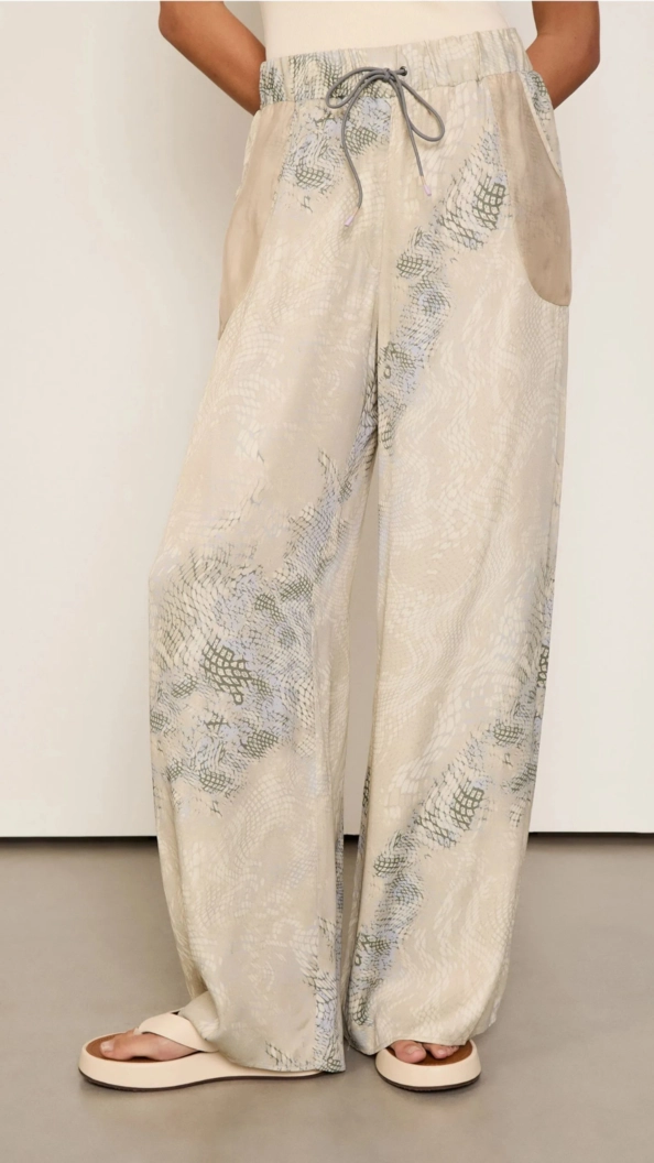 Modelagem reta e fluida com cintura média e comprimento alongado, perfeita para valorizar a silhueta. Possui elástico no cós com ajuste por amarração e bolsos.