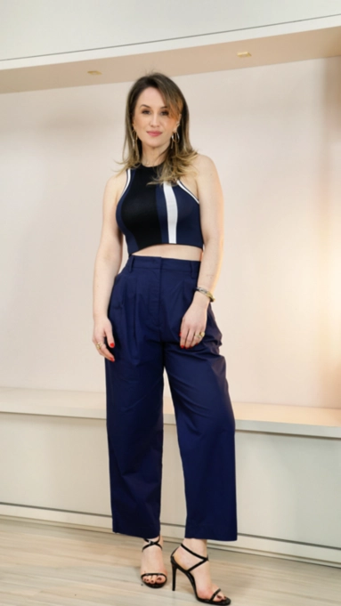 Modelagem reta com cintura alta e comprimento cropped, ideal para valorizar a silhueta com sofisticação. Pregas frontais e fechamento por zíper e colchete, trazendo estrutura.