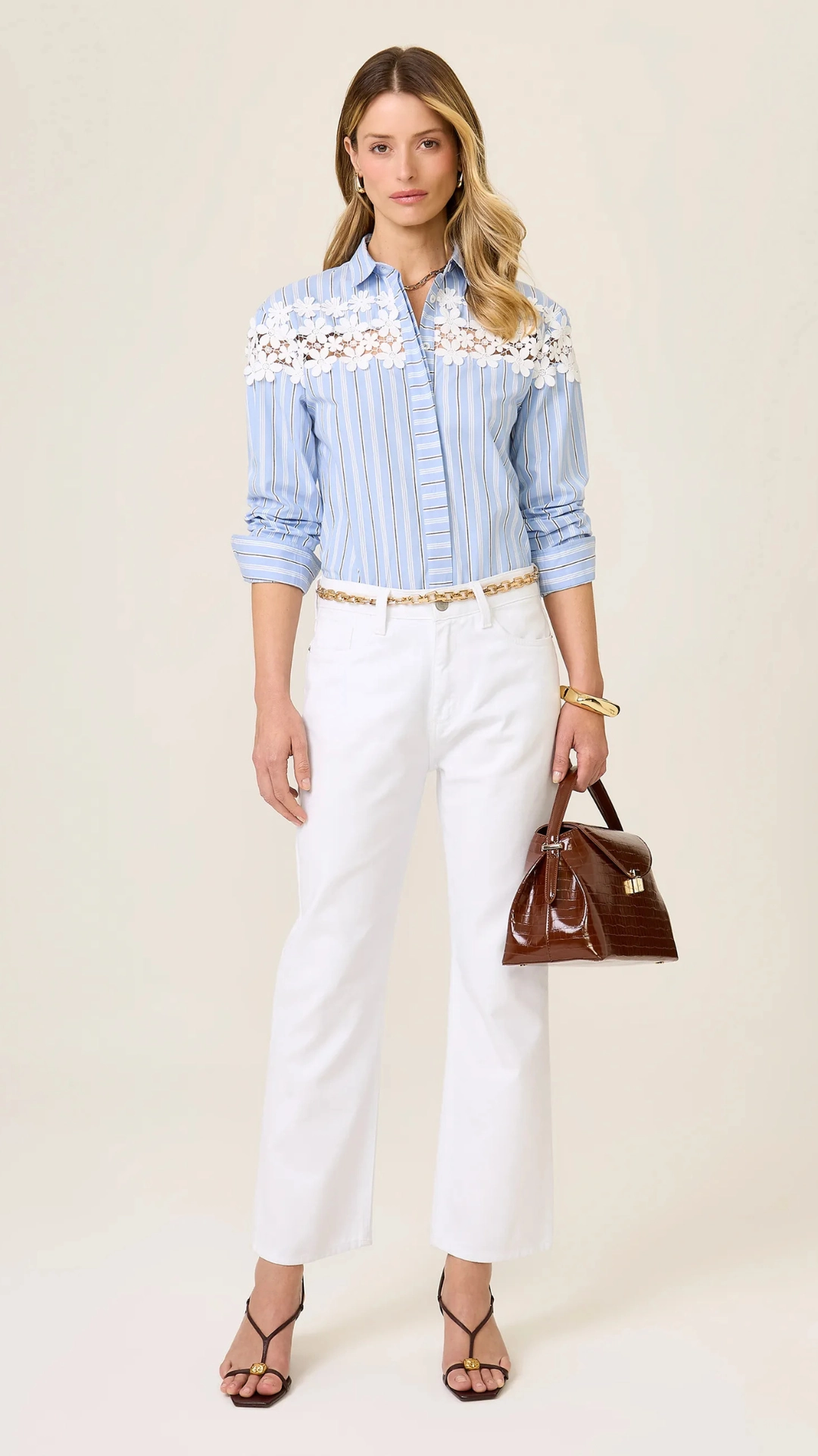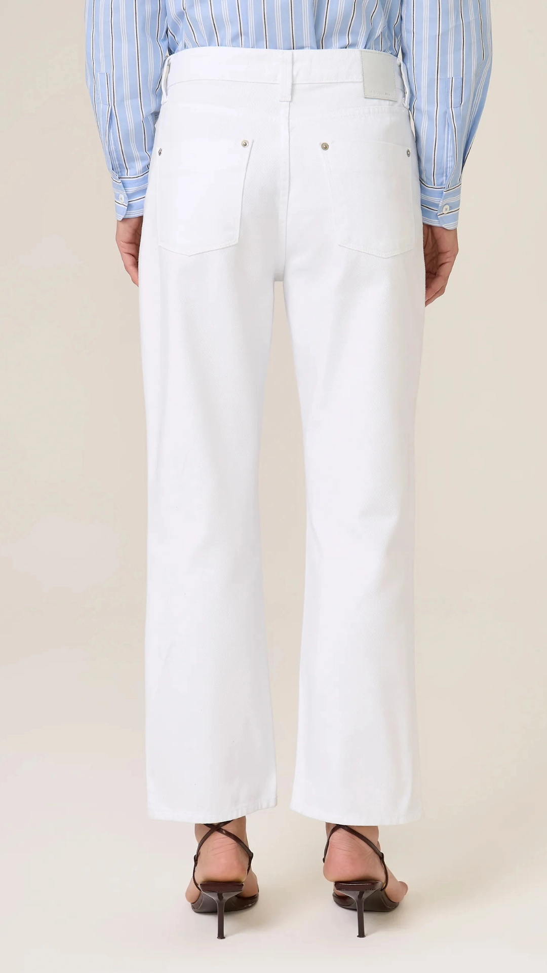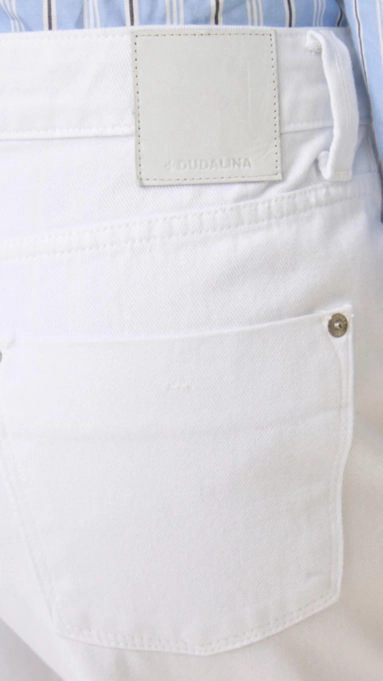 Modelagem reta com cintura média e comprimento levemente cropped. Possui bolsos traseiros e frontais, além de passantes para cinto.