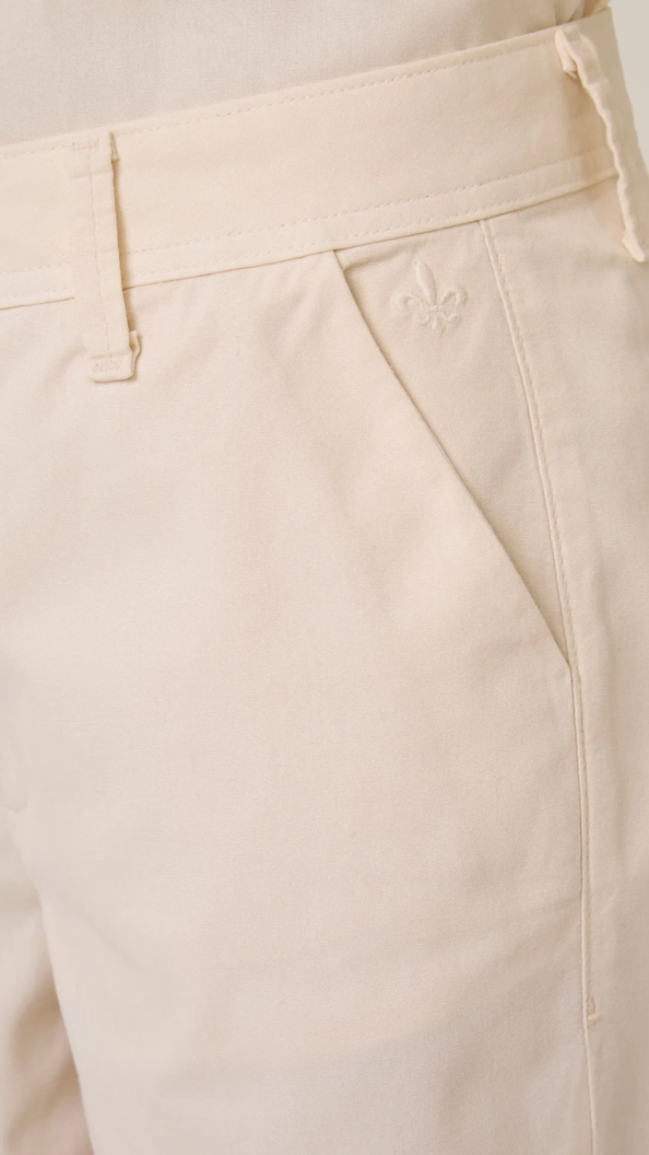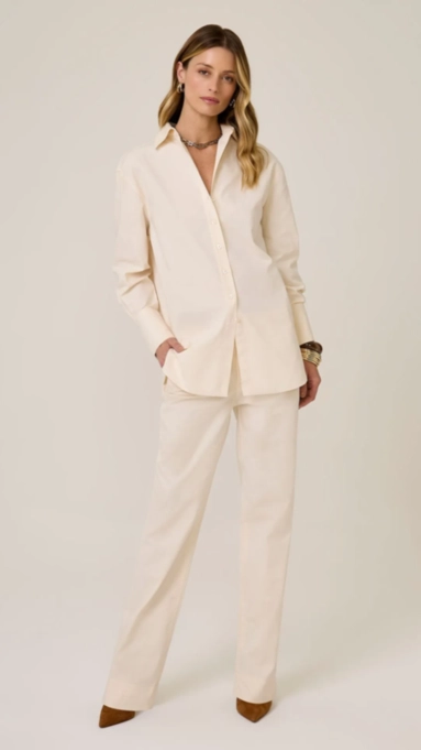 Confeccionada em sarja 100% algodão, com toque encorpado e confortável. Ideal para os dias frescos ou ambientes climatizados, sem perder a leveza no visual.