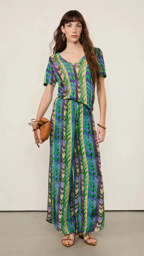 Camiseta com modelagem reta, decote em V e mangas curtas. O print chevron em tons vibrantes traz personalidade e um toque moderno à peça.