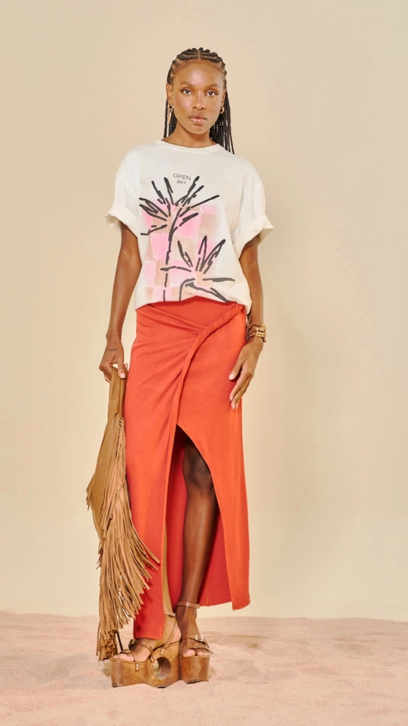 Camiseta oversized garantindo conforto absoluto, mangas dobradas e a estampa frontal com palmeiras estilizadas criam um visual moderno e descontraído.