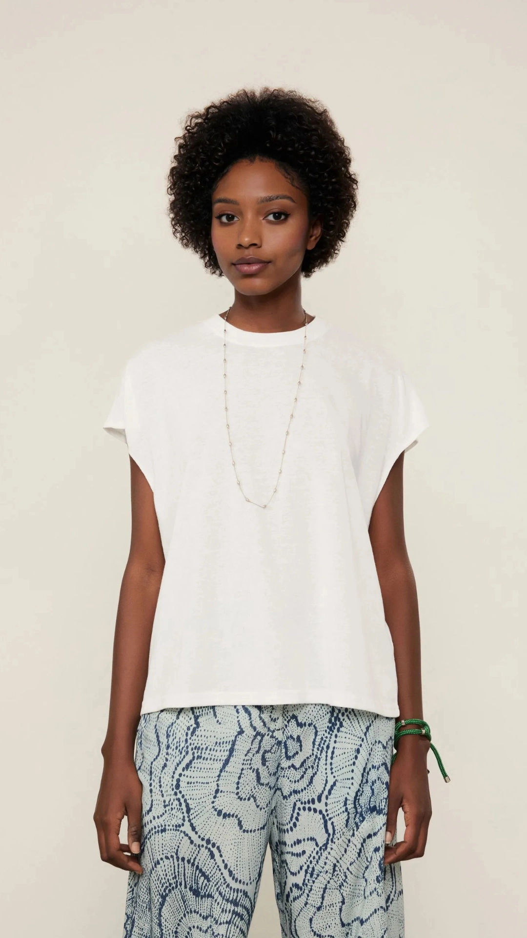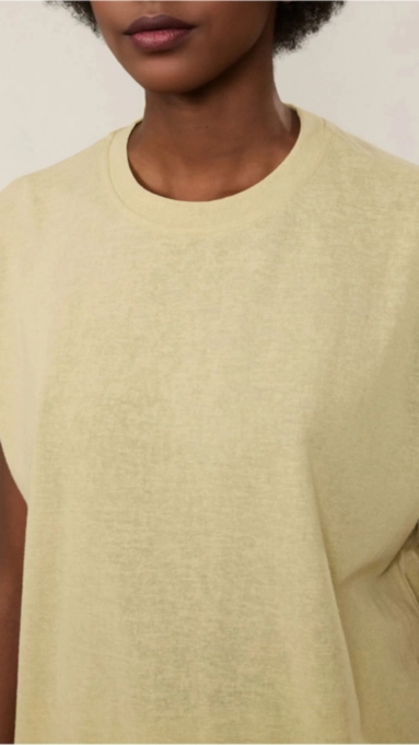 Camiseta de malha com modelagem reta e sem mangas, ideal para produções minimalistas. Gola careca e acabamento limpo nas cavas, caimento solto favorecendo todos os tipos de corpos.