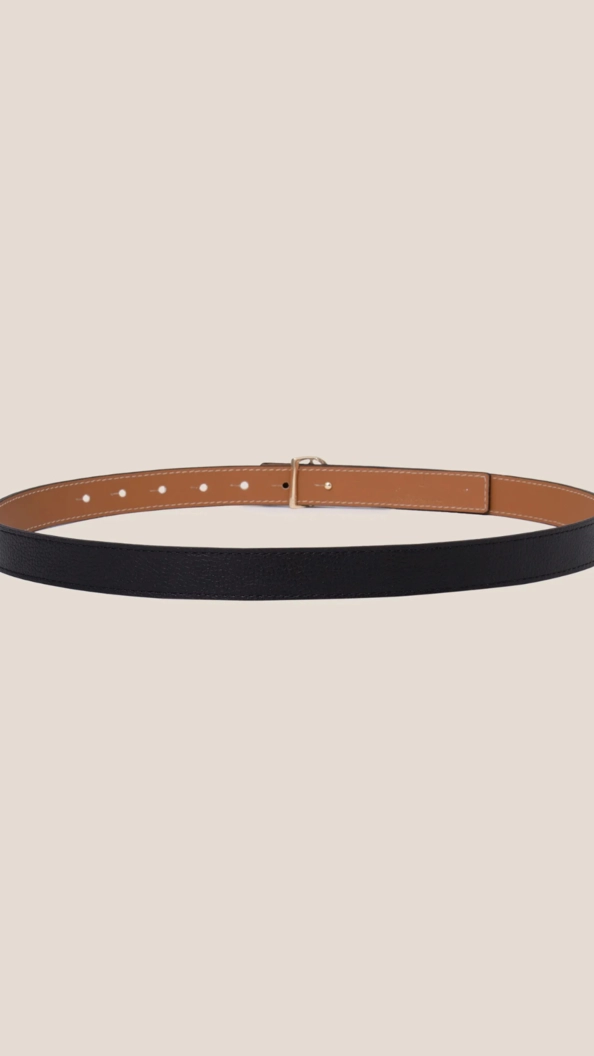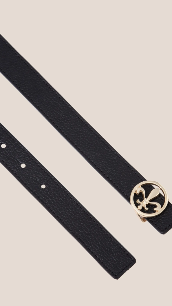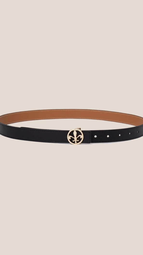 Cinto em couro legítimo, design clássico e funcionalidade dupla face (preto e camel). Fivela dourada com flor de liz para um toque sofisticado e atemporal, elevando o seu visual.