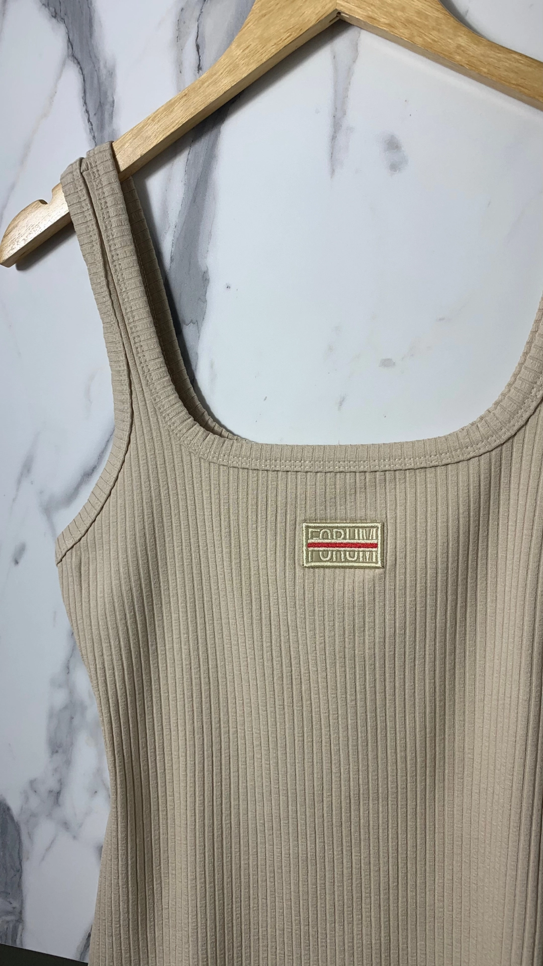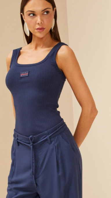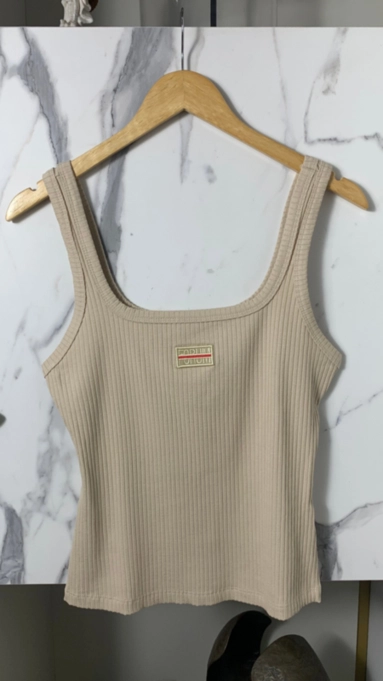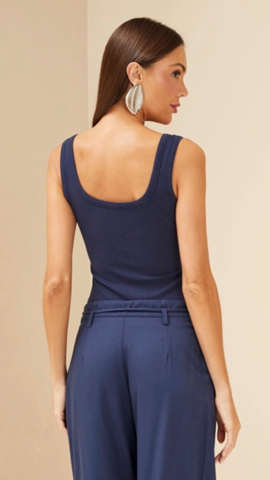 Regata canelada com modelagem justa, decote quadrado e alças largas que valorizam o colo e os ombros.