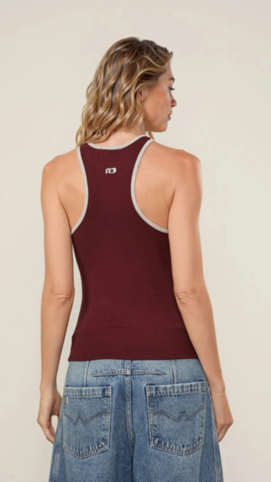 Modelagem justa com cava nadador, valorizando os ombros e garantindo um visual moderno. Acabamento contrastante e comprimento levemente cropped, ideal para produções despojadas.