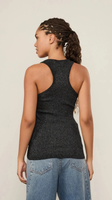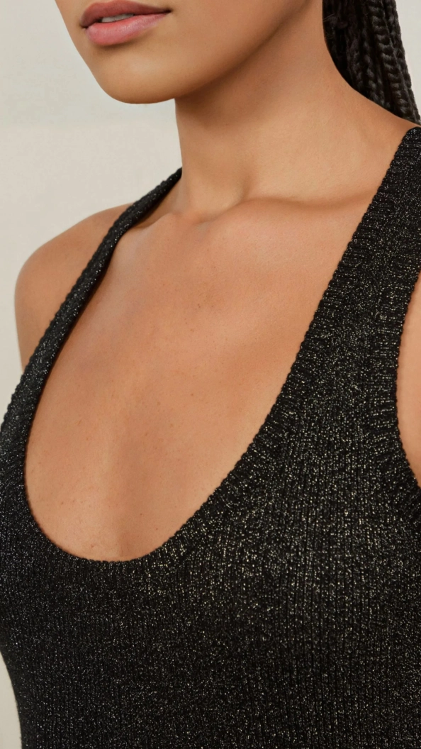 Modelagem nadador com decote e corte ajustado, ideal para destacar a silhueta. Tricot com fio de lurex para um efeito metalizado sutil e glamouroso.