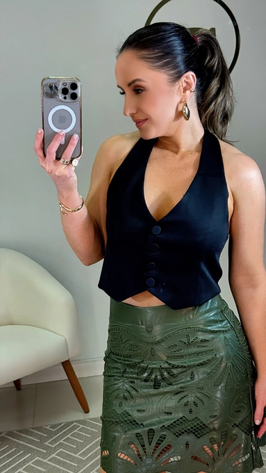 Modelagem reta com comprimento mini e acabamento em recortes a laser. A barra ondulada e o recorte vazado trazem leveza, cintura média e zíper lateral para melhor ajuste.