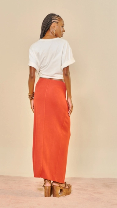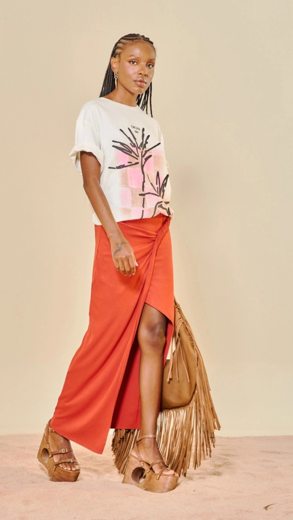 Modelagem midi com fenda frontal e recorte transpassado, valorizando o movimento. Destaque do cós torcido assimétrico, trazendo charme e modernidade ao visual.