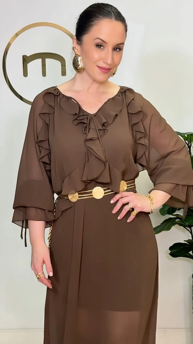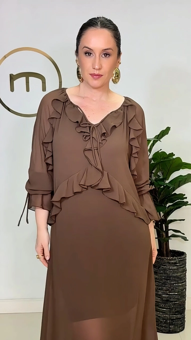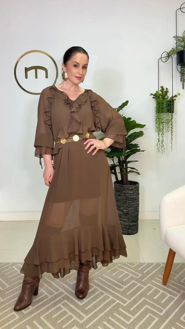 Vestido longo em chiffon de poliéster com babados. Acompanha combinação para ser usada como forro.
