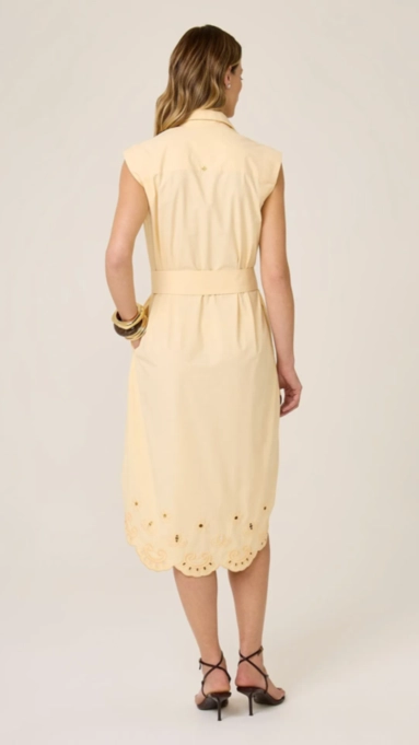 Modelagem chemise sem mangas, gola clássica e fechamento frontal por botões. Possui faixa para ajuste na cintura, permitindo valorizar a silhueta com charme.
