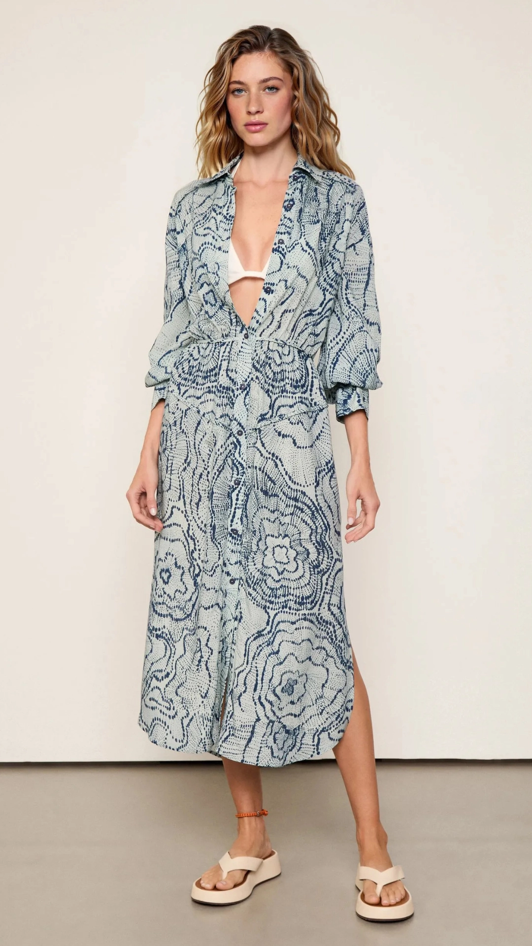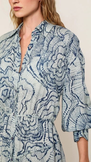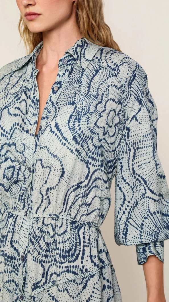 Chemise de comprimento midi com modelagem reta e ajuste na cintura por elástico. Gola tradicional, botões frontais e mangas com punhos marcados, além de fendas que garantem movimento e fluidez.