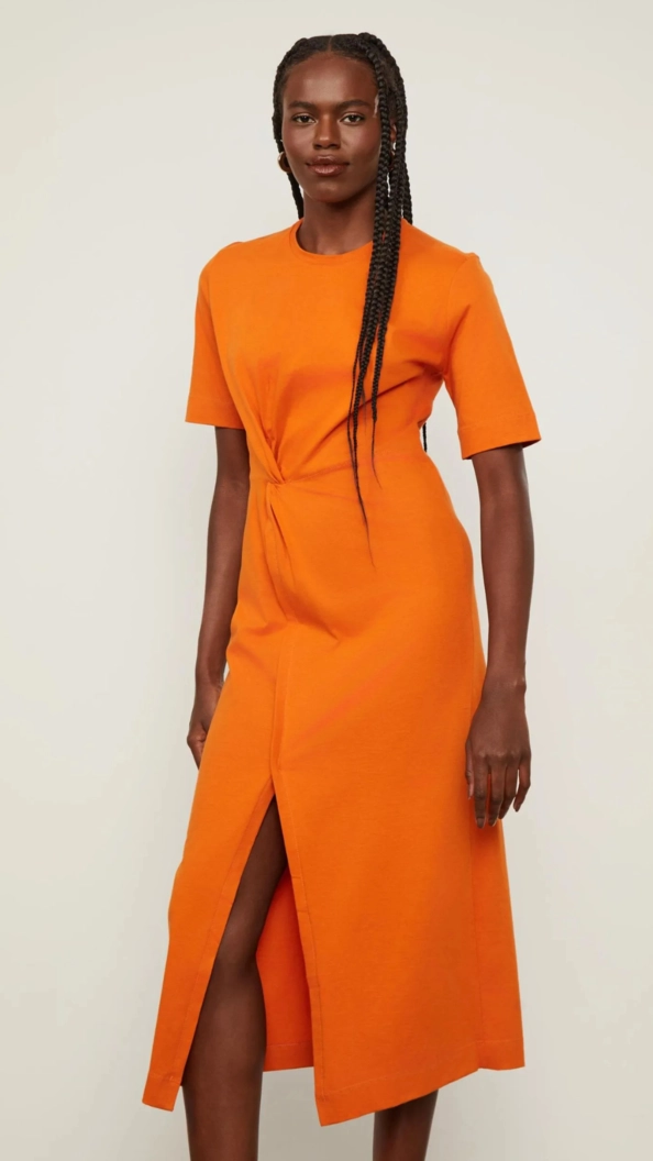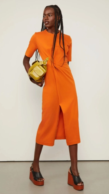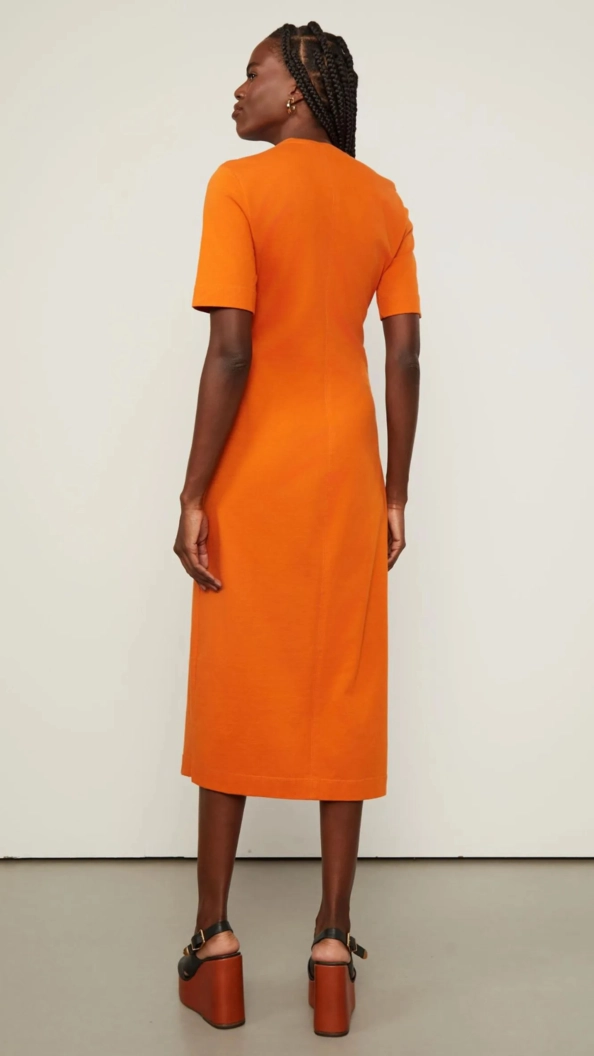 Vestido midi com modelagem ajustada na parte superior e saia reta com fenda frontal, trazendo movimento e sensualidade na medida certa.