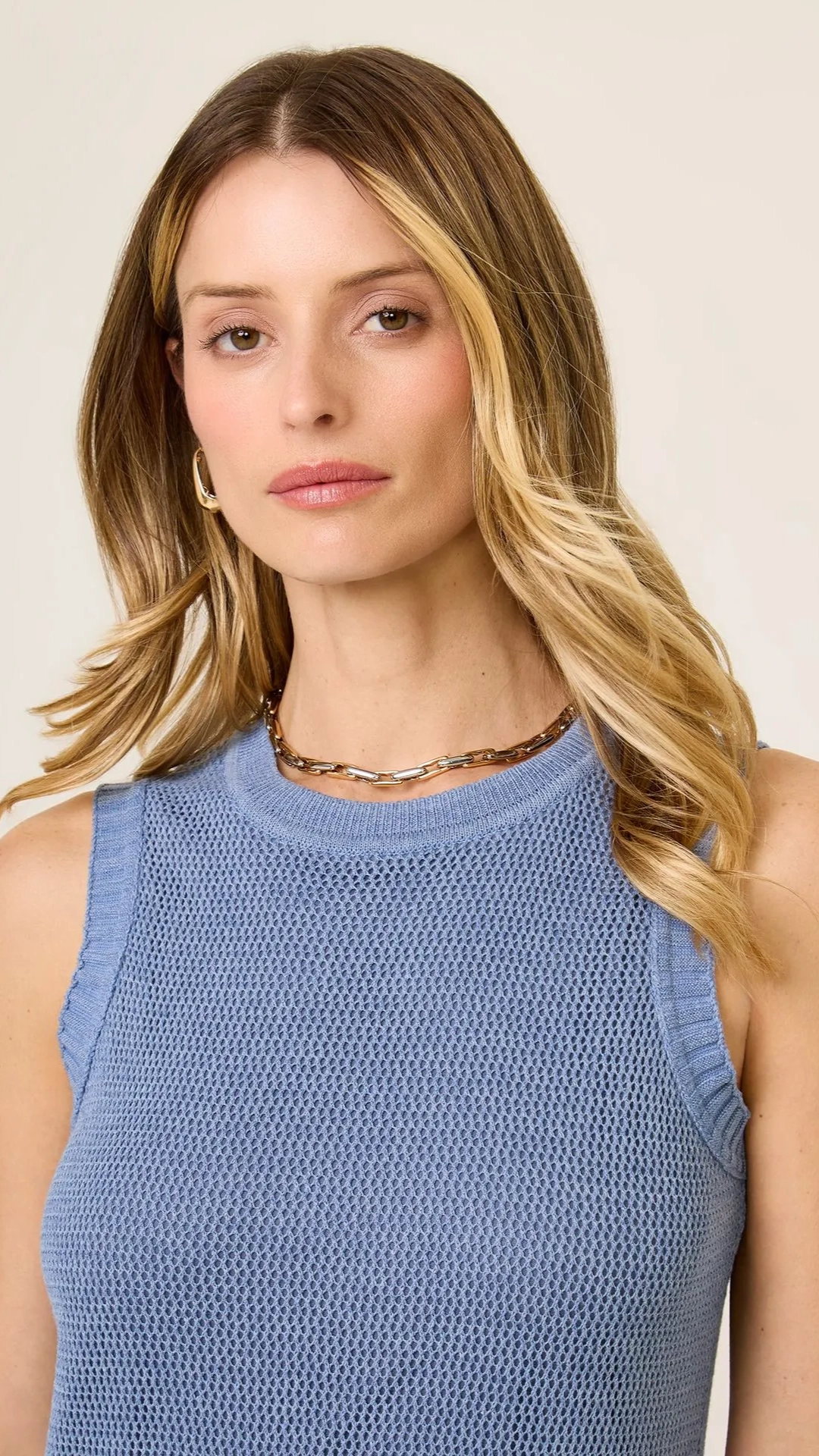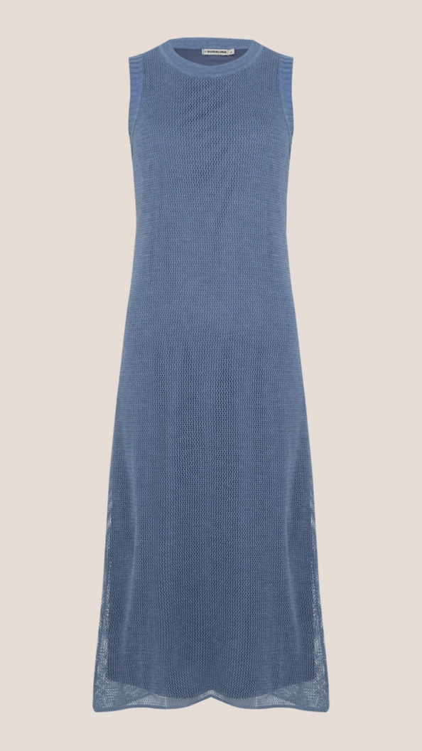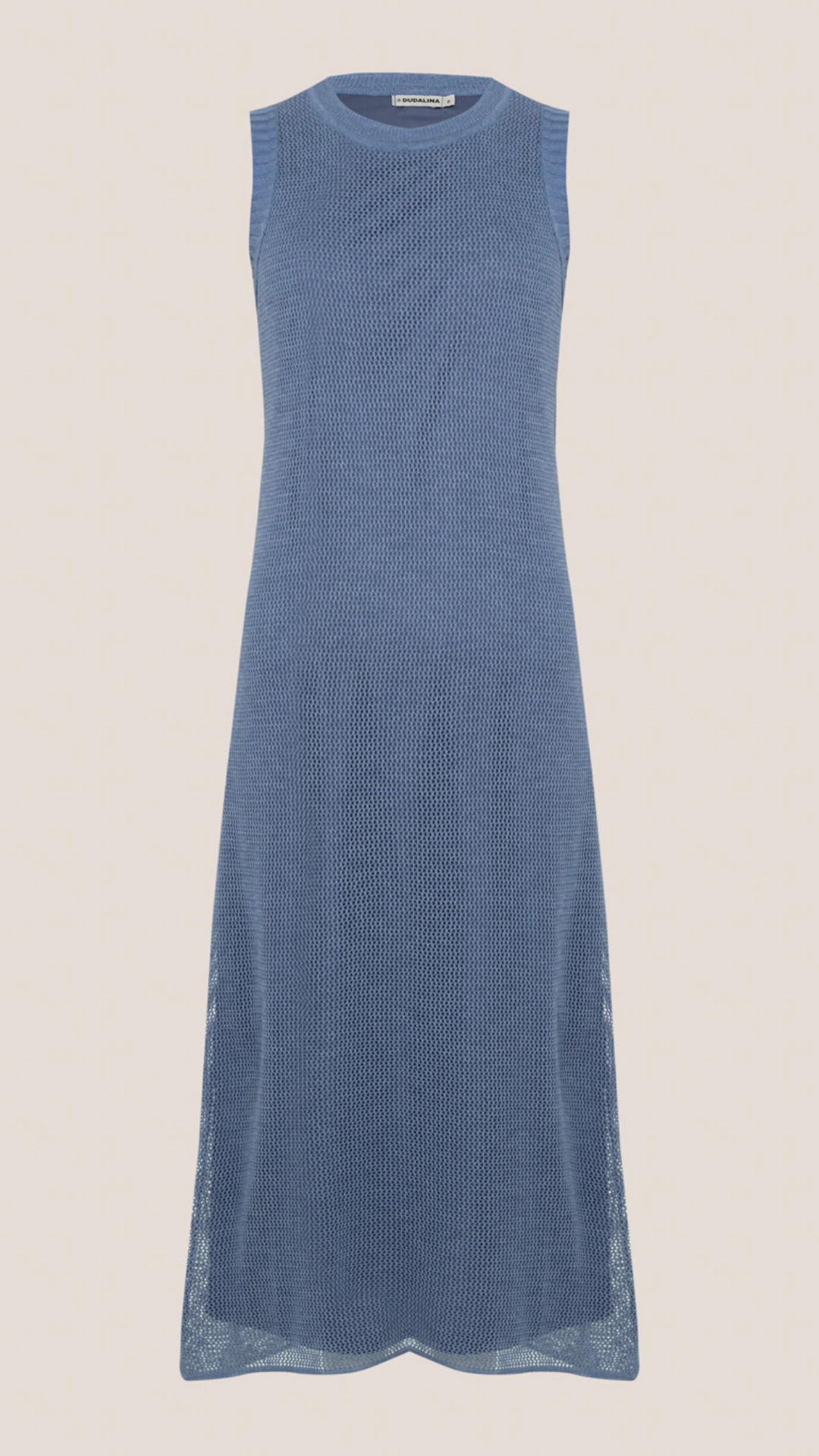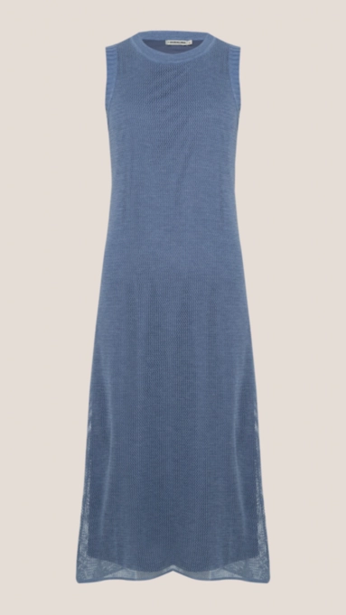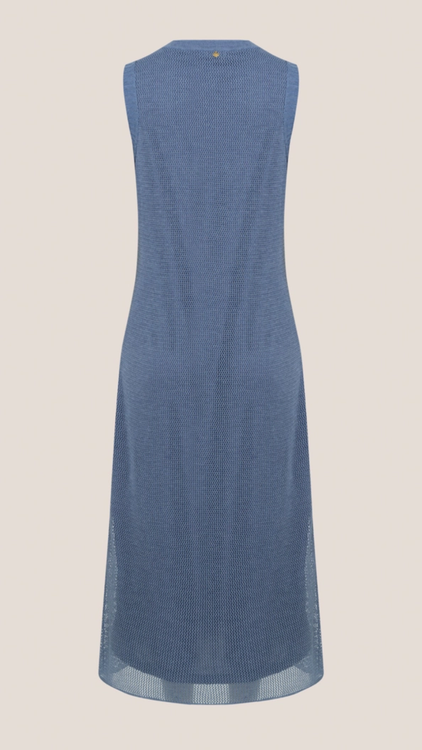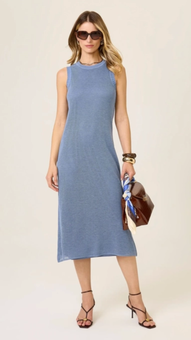 Modelagem reta e comprimento midi, cava ampla e gola careca. Tricot em ponto vazado garantindo leveza e modernidade, acabamento canelado nas cavas e gola.