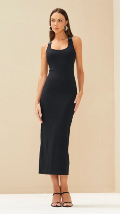 Vestido midi justo confeccionado em malha ponto Roma, modelagem que valoriza as curvas de forma elegante e confortável. Alças largas com elástico personalizado e decote arredondado.