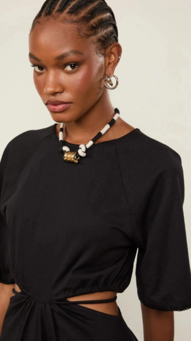 Modelagem evasê e recortes estratégicos, moderno na medida certa. Mangas amplas, amarração nas costas e acabamento com leve bordado no decote e mangas, agregando sofisticação.