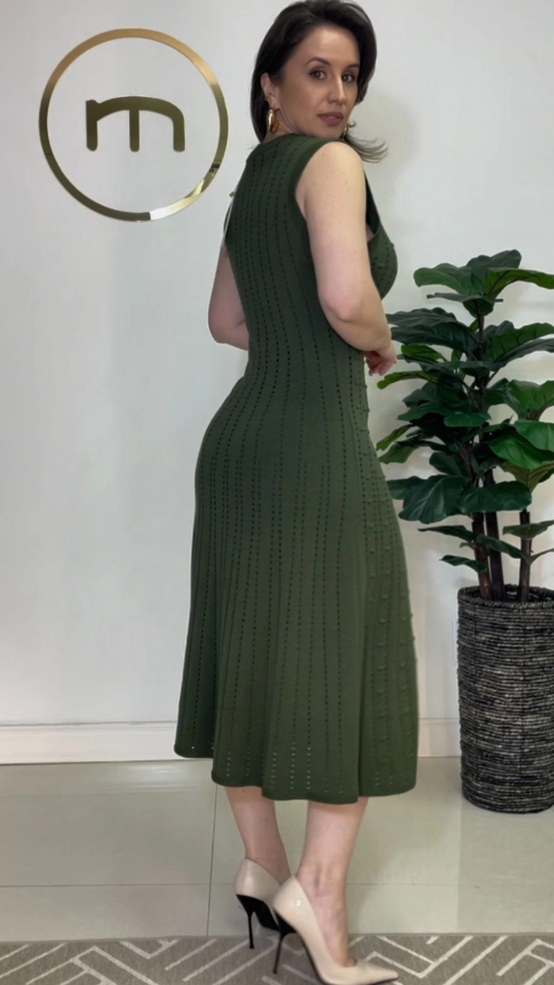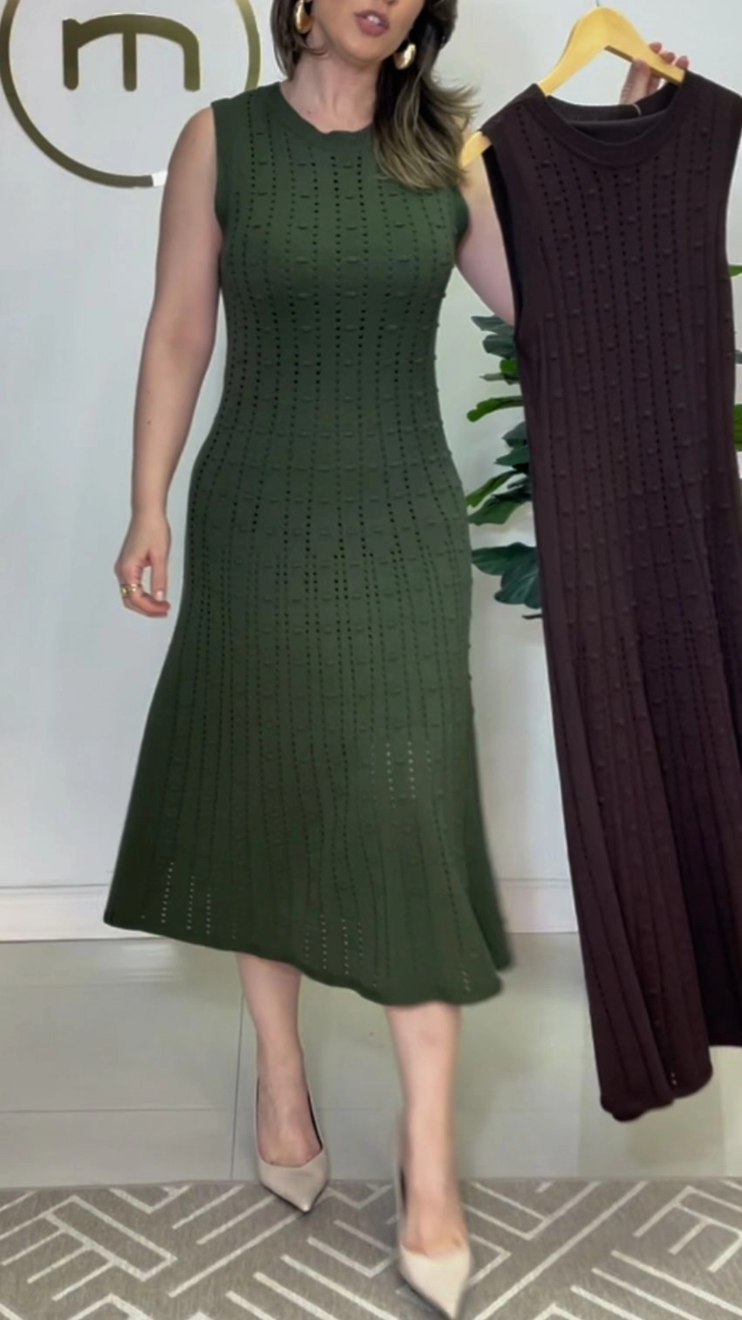 Vestido midi em tricot, modelagem reta com caimento fluido e gola redonda, trazedo leveza à silhueta.
