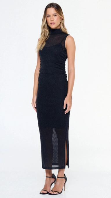 Modelagem ajustada ao corpo, sem mangas e com gola alta que traz um toque moderno. Destaque para as costas abertas e a leve transparência na barra e fenda lateral.